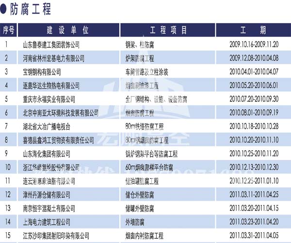 宏順建設(shè)工程有限公司是國(guó)家批準(zhǔn)成立的專業(yè)高空作業(yè)企業(yè):承攬過(guò)(國(guó)內(nèi).國(guó)外)煙囪新建、煙囪防腐、吊機(jī)防腐、水塔防腐、管道防腐、龍門(mén)吊防腐、儲(chǔ)存罐防腐、煙囪內(nèi)壁防腐等高空作業(yè)工程。具有“不搭腳手架 、 不需要停產(chǎn)”施工特點(diǎn)。